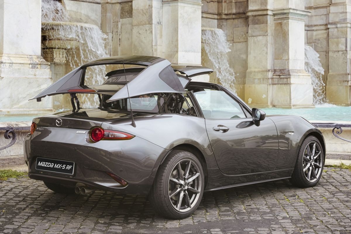 Want betaalbaarheid is, zeker tegenwoordig, relatief. Een Mazda MX-5 kost nu minimaal €43.239, waarmee het - op een verdwaalde Mini en een paar kleine semi-cabrio’s na - nog steeds de voordeligste manier om open lucht en nieuwe auto-geur tegelijkertijd te kunnen ervaren. Over semi-cabrio gesproken, ook die levert Mazda in de vorm van de MX-5 RF. Deze Retractable Fastback heeft een stalen klapdak dat in de carrosserie kan verdwijnen, waarna een targa-achtige koets overblijft.