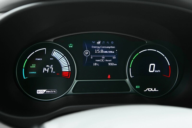 Zodra je gaat rijden, ervaar je echter meteen de voordelen van het accupakket. De capaciteit is 27 kWh en volgens Kia heeft het pakket de hoogste energiedichtheid per kilo. Uiteraard kunnen de accu's zowel via een wallbox thuis als via een snellader worden voorzien van verse energie. In dat eerste geval duurt laden zo'n vijf uur, bij een Chedemo-snellader laad je in een halfuurtje tot 80 procent op. Hoe het ook zij, als we de startknop indrukken, meldt het vrolijke display voor onze neus dat we bijna 170 kilometer kunnen rijden. En tijdens de rit lijkt dat aardig uit te komen, waarmee de Soul in de praktijk een heel redelijke actieradius heeft ten opzichte van zijn directe concurrenten. Overigens is het dan wel zaak niet veel sneller dan 100 km/h te rijden, want daarboven neemt de actieradius snel af. Best jammer, want de aandrijflijn heeft meer dan genoeg pit om ook boven die snelheid z'n mannetje te staan. De elektromotor levert 110 pk en een fors koppel van 285 Nm – dat laatste uiteraard al vanaf stilstand. In de praktijk is de Soul EV daardoor buitengewoon elastisch, met alle voordelen die we kennen van de elektrische auto. In alle rust en stilte accelereer je dus vlot naar elke gewenste snelheid, al is de Soul wel zo afgesteld dat de versnelling zo gematigd mogelijk gaat. Dat uiteraard met het oog op het maximaliseren van de actieradius. Om dezelfde reden remt de Soul al meteen bij het loslaten van het gaspedaal af op de elektromotor om energie terug te winnen. Dat, en het feit dat het pedaal vrij veel weerstand biedt, zorgt ervoor dat het remmen wat gewenning vergt.