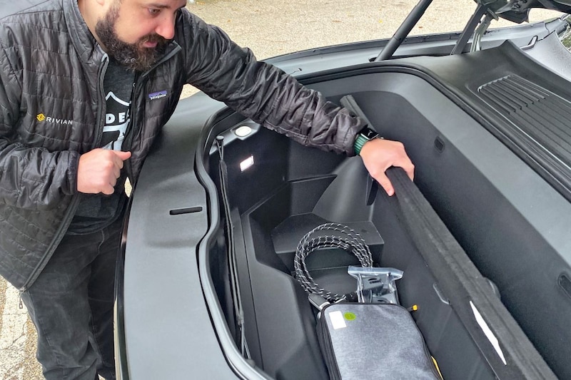 De Porsche-waardige acceleratie kost wel energie, uiteraard, maar omdat de 135 kWh accu (‘Large Pack’) in de bodemplaat ligt, heb je nog genoeg speelruimte. Je kunt ook kiezen voor een conserveringsmodus die de actieradius stabiliseert door twee van de vier motoren uit te schakelen. Dan wordt de R1T een voorwielaandrijver.