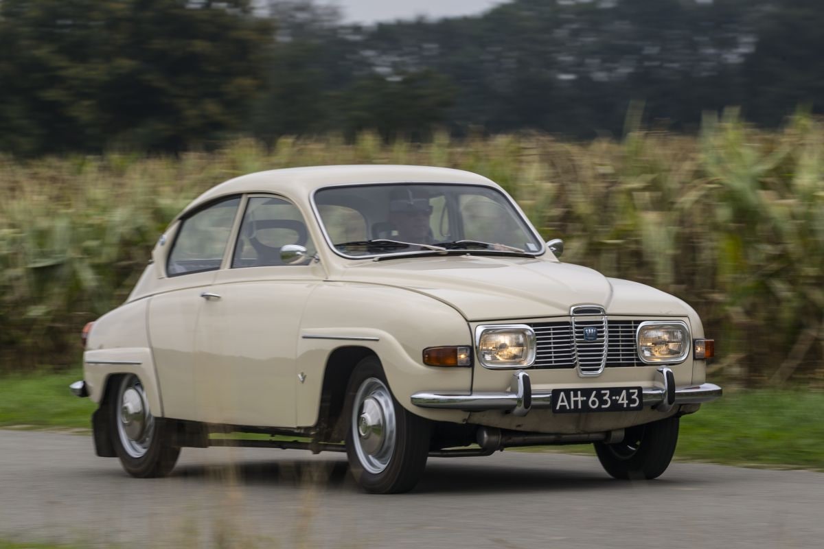 Op de achterbank is eveneens voldoende plek. De vierversnellingsbak laat zich soepel bedienen met het kleine pookje aan de stuurkolom. Door de vrij diepe zit voel je je onbewust nog eens extra veilig in de Saab en je kunt ervan uitgaan dat hij op dat vlak beter scoort dan zijn tijdgenoten. Dankzij de ver naar voren geplaatste motor in combinatie met voorwielaandrijving is de rechtuitstabiliteit uitstekend. Een zeer koersvaste auto waarmee je in alle rust met een vaartje van 110 km/h over de snelweg kruist. Met de herrie valt het mee. De vormgeving van de instrumenten doet sterk denken aan die van een Volkswagen Kever, het zijn dan ook klokken van VDO. De klassieker is in zeer goede, originele staat en in de kofferbak vinden we zelfs een oud exemplaar Van AutoWeek waarin deze Saab ooit op twee pagina’s prijkte. Hij is mooi genoeg om nog eens op te treden!