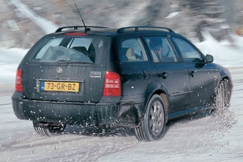 Ook als we in de sneeuw gaan vegen, blijft de wagen als een voorwielaandrijver handelen. Komt de kont om, dan is het een kwestie van gasgeven, en via een tijdelijke vierwieldrift gaat de balans redelijk snel weer over op onderstuur. Toch levert de vierwielaandrijving wel degelijk heel goed werk. Als op diverse plekken langs de weg mensen aan het ploeteren zijn met sneeuwkettingen, kunnen we met onze Octavia nog gewoon vooruit komen. Als een echte steile besneeuwde top gescoord moet worden, mist de Skoda helaas de mogelijkheid om 'm in een lage gearing te zetten. Maar goed, voor bergbeklimmen is 'ie niet gemaakt. Dit 4WD-systeem zit er met name op voor de veiligheid. En dat werkt. Als 't écht glad is, maakt het geen moer uit hoeveel vermogen je onder je rechtervoet hebt, maar komt het aan op grip, tractie en handelbaarheid. Waarbij ook de banden een belangrijke rol spelen. We hebben op een ijzige sneeuwplaat eens alles uitgeprobeerd: remmen bergaf, dan een ultrakorte hairpin, vervolgens weer 'n stukje klimmen en tenslotte een lange doordraaiende bocht. De met Dunlops SP Sport 2000 E (205/55 16") geschoeide Skoda doet het redelijk. Deze banden zijn natuurlijk niet echt geschikt voor de aalgladde omstandig-heden, maar door de vierwielaandrijving doet de Octavia het keurig. Natuurlijk wordt het allemaal een ander verhaal als we winterbanden onder de auto zouden schroeven. Om dit uit te vinden, hebben we de Dunlop Sports van de Skoda verruild voor een setje Dunlop SP Winter Sport in dezelfde maat. Een wereld van verschil. De winterbanden scoren op alle fronten beter!