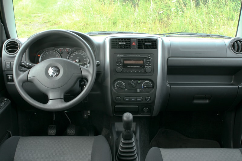 Hoe anders is het met de kleine Suzuki Jimny. De auto is nog helemaal opgezet volgens de klassieke principes van de terreinautobouw: een separaat ladder chassis, starre assen, een in lengterichting geplaatste motor en inschakelbare vierwielaandrijving voorzien van een hoge en lage overbrenging. Met een stuurinrichting die sterke verwantschap vertoont met die van grote vrachtwagens, een onderstel dat associaties oproept met een paardenkar en een interieur waar een blind paard (als het er al in zou passen) geen schade lijkt te kunnen doen, is dit absoluut geen auto voor de verwende automobilist. Wie het letterlijk wat hogerop zoekt en alleen maar voor de looks van een SUV gaat, kan beter met een wijde boog om de Jimny heen lopen.