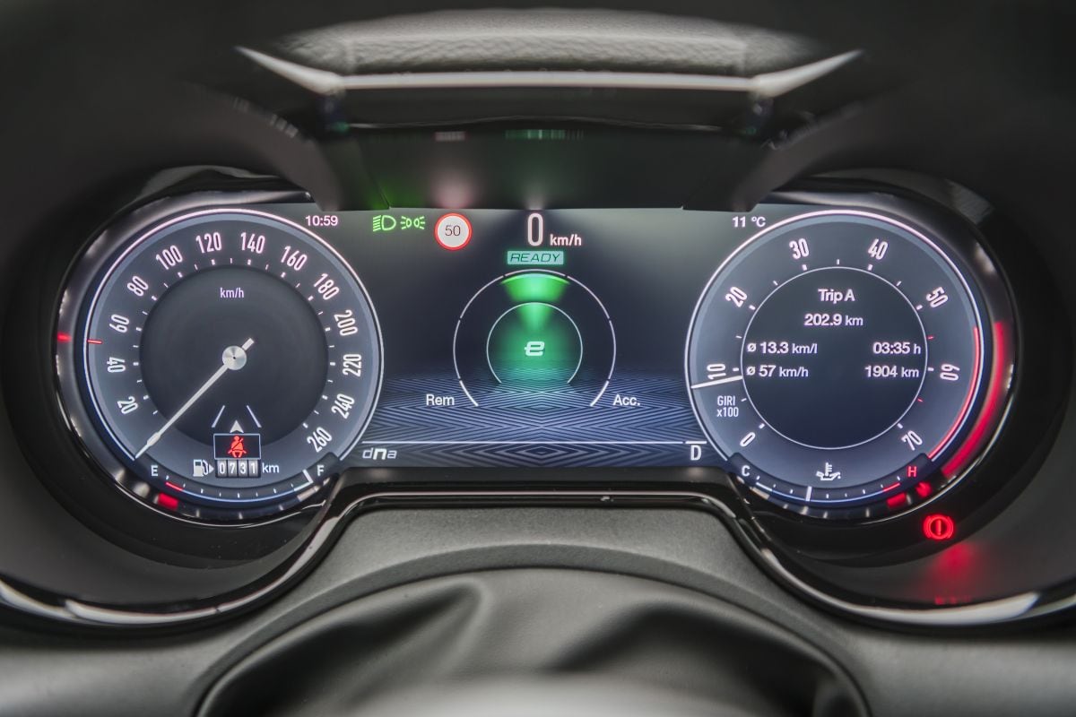 Ook de lay-out van het digitale instrumentarium is doordrenkt van Alfa Romeo-dna, waarbij de klassieke basisvorm met twee diepe klokkokers bewaard is gebleven. Ook springt de DNA-knop voor de rijprogramma’s (Dynamic, Normal en Advanced) in het oog. Die zit hoog op de middenconsole, gemakkelijk onder handbereik, dicht bij het stuur.