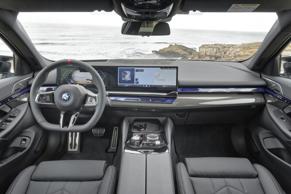 Eén carrosserie voor alle aandrijfvarianten betekent ook één interieur voor alle aandrijfvarianten. In het instrumentarium kom je hier of daar een andere metertje tegen, maar het interieur wordt er verder niet groter of kleiner van. BMW mag de compromissen niet noemenswaardig vinden, de i5 heeft voor een EV wel een behoorlijke middentunnel. Bij de versies met verbrandingsmotor gaan daar de versnellingsbak en de cardanas onder schuil. Bij de i5 wordt nu van de gelegenheid gebruik gemaakt om daar nog wat accucellen in weg te bergen. Jammer, nu heb je minder opbergruimte voor losse spullen en de middelste achterpassagier moet met zijn benen wijd zitten.