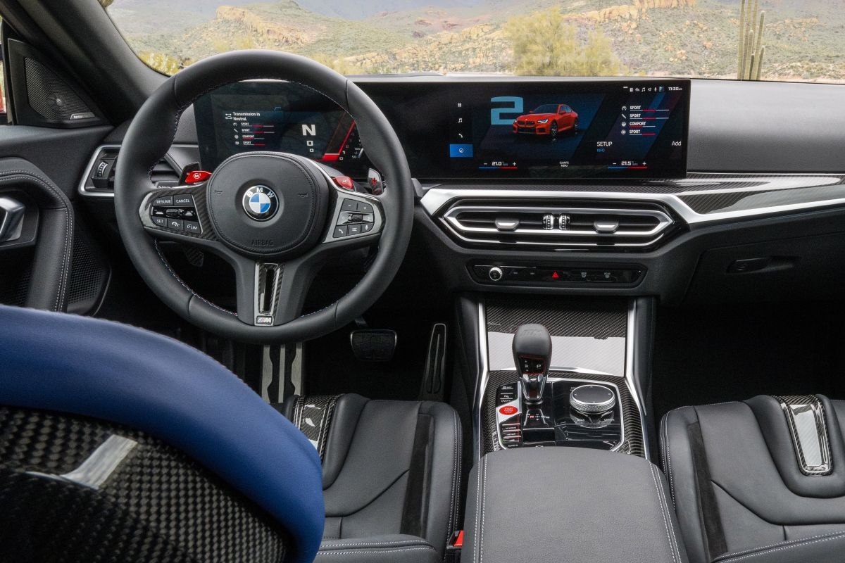 Je zit heel laag in de M2, maar wanneer je denkt in te stappen in een lekkere oldskool coupé dan brengt het uitzicht voor je je meteen weer in het heden. De modernste dashboardstijl van BMW zorgt voor een bijna EV-achtige experience wat komt door de toepassing van het enorme doorlopende beeldscherm dat over het dashboard heen ligt. Heel veel weergaves zijn in een moderne layout, een klassiek ogende meterweergave om in te stellen is er niet. Alsof je in een een M3 of M4 zit dus. Achter je heb je niet zo veel auto, maar daar heb je wel een normale achterbank.
