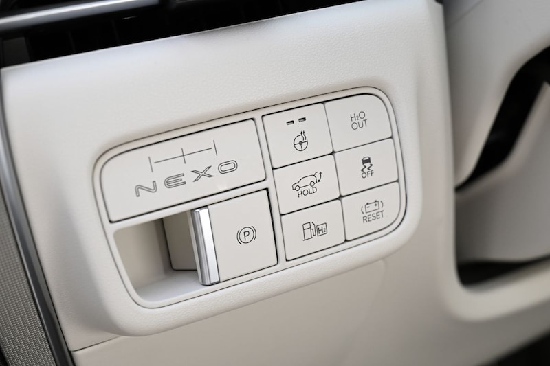 Op een volle tank moet je 826 WLTP-kilometers kunnen afleggen, dat is veel meer dan de vorige generatie Nexo die een actieradius heeft van 665 kilometer. Dat verschil komt niet alleen doordat de nieuwe Nexo een grotere tank heeft, maar ook doordat de nieuwe zuiniger is geworden. Hij heeft volgens opgave 0,81 kg waterstof nodig per 100 kilometer waar dat bij de vorige editie 0,95 kg is. De waterstofnippel zit achter een klepje in het linker achterscherm. Aan de andere kant, in het rechter achterscherm, zit ook een klepje. Hierachter gaat een stopcontact schuil, want deze auto is geschikt voor V2L, vehicle to load. Je kunt zonder tussenkomst van adapters gewoon een stekker in de Nexo steken, handig op de camping of bij klussen buitenshuis.