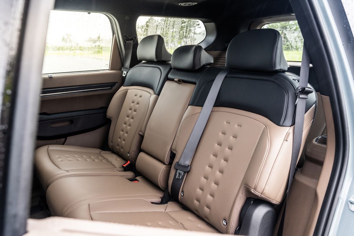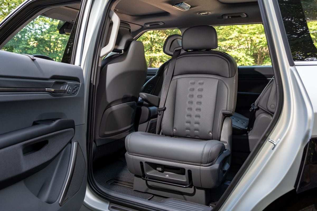 Standaard krijgt de EV9 een driezits bank op de tweede zitrij en twee extra stoelen helemaal achterin, desgewenst kun je in het midden ook twee stoelen laten plaatsen. Die kun je verschuiven en zelfs draaien, bijvoorbeeld om je kind gemakkelijk in het kinderzitje te kunnen zetten. Maar je kunt ze ook 180 graden draaien om met de passagiers helemaal achterin te kunnen keuvelen. Waarbij de derde zitrij overigens alleen geschikt is voor kleinere mensen.