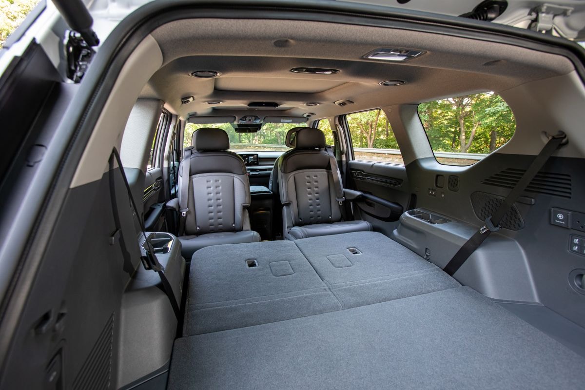 Als alle stoelen op hun plek staan, is er nog ruimte voor circa 330 liter bagage. Als je de beide stoelen achterin omklapt (helemaal uitbouwen is niet mogelijk) neemt dat toe naar 823 liter. Meer informatie over de bagageruimte geeft Kia nog niet. De EV9 krijgt voorin ook een ‘frunk’ mee voor je laadkabel, met een bescheiden inhoud van 52 liter bij de vierwielaandrijver en een riantere 90 liter bij de versie met tweewielaandrijving.