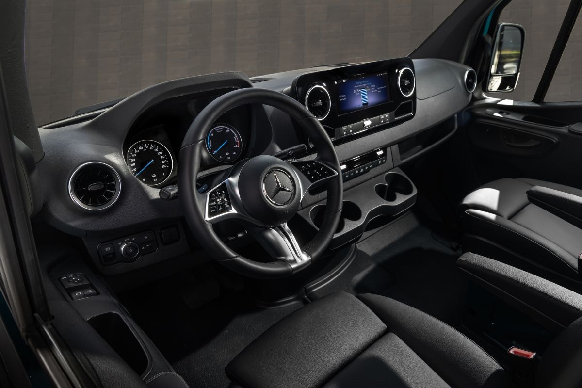 Nee, niet bepaald. Mercedes heeft opmerkelijk veel eigenschappen van de luxe personenauto’s in deze bestelauto gestopt. Zo zit hij boordevol veiligheidssystemen en rijhulpen. Optioneel is een digitale achteruitkijkspiegel, waardoor je altijd zicht hebt dankzij de camera achter op de auto: ideaal in een gesloten bestelwagen. Ook de kunstmatige intelligentie van het MBUX-infotainment (Mercedes-Benz User Experience) zit in deze bestelauto. Dat brengt een 10,25- inch beeldscherm met zich mee en werkt snel en overwegend ook logisch. Je kunt met de bijbehorende app op afstand portieren vergrendelen of ontgrendelen en ook de ramen bedienen. De computer herkent zelfs of de bestuurder of bijrijder tegen hem praat. Roep ‘Hey Mercedes’ en de auto neemt bepaalde opdrachten aan of geeft je informatie. Voor het eerst zijn de grafische navigatiekaarten te vervangen door satellietbeelden. Diezelfde navigatie houdt bijvoorbeeld ook rekening met de beperkingen van grote voertuigen of het rijden met aanhangers.