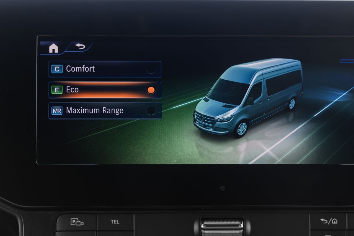 Wie met de nieuwe eSprinter op weg gaat, merkt al gauw dat hij afrekent met flink wat nadelen van het dieseltijdperk. Deze milieuridder kent geen uitlaatgas. Ook profiteert de bestuurder van zijn fluisterstille karakter, wat het comfort ten goede komt. Dat is sowieso goed voor elkaar in deze Mercedes: je zit prima op goede steun biedende stoelen en het veercomfort is verrassend prettig. Je merkt hooguit dat de schokdempers met hun soms stevige reacties erop berekend zijn om een flinke lading te kunnen dragen. De aandrijflijn blijkt krachtig en soepel: de elektromotor, uiteraard gekoppeld aan een automaat, is 100 of 150 kW sterk. De batterijpakketten zijn 113 kWh, 81 kWh of 56 kWh groot. Doordat het batterijpakket tussen de assen is geplaatst, ontstaat een lager zwaartepunt met minder kans op overhellen van de auto. De besturing blijkt niet alleen heerlijk licht, maar ook verrassend scherp voor een dergelijke auto. Drie rijmodi helpen de bestuurder te kiezen tussen maximaal comfort of een maximale actieradius. Eco Assist analyseert continu of er een voertuig voor de eSprinter rijdt, wat de maximumsnelheid is en of er een helling volgt op de gekozen route. Vervolgens kan het systeem de bestuurder adviseren om de voet van het gaspedaal te halen en zodoende stroom te besparen.