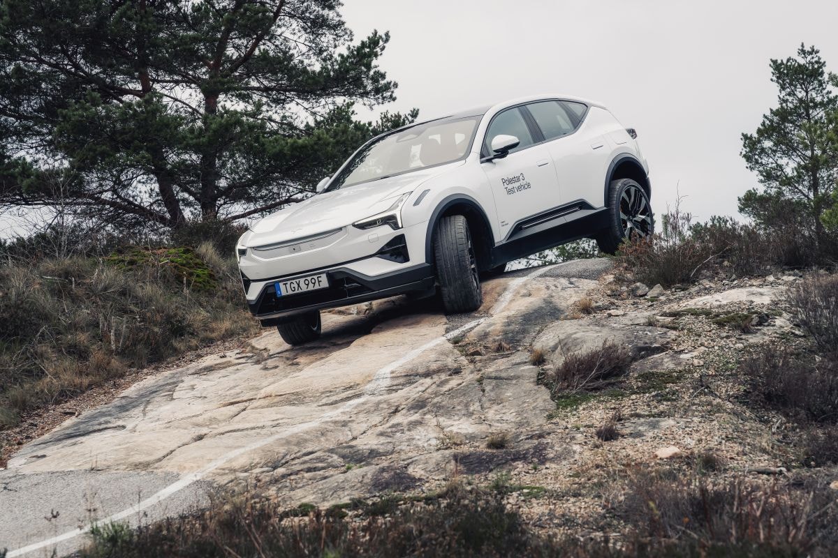 Vierwielaandrijving en luchtvering zorgen dat je ook off-road nog een eind komt met de Polestar 3.