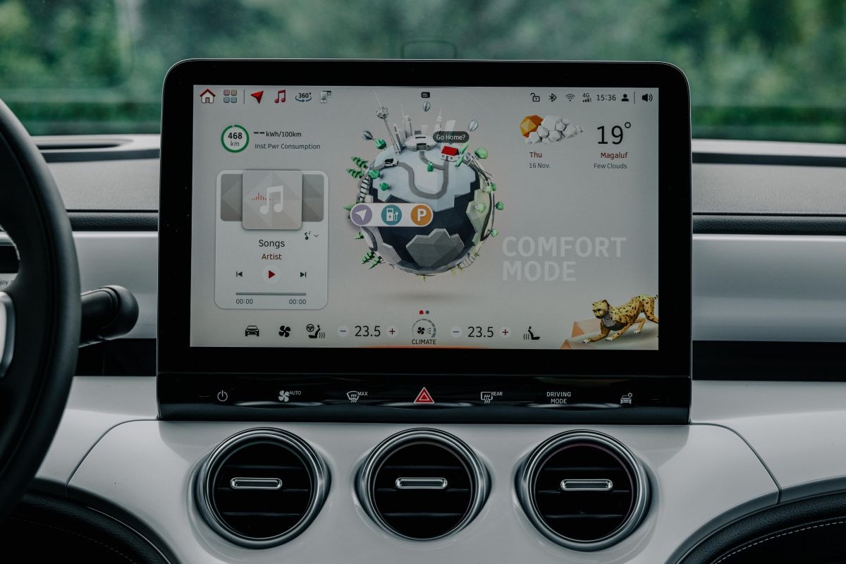 De vormgeving van het dashboard doet futuristisch aan en lijkt vrijwel gelijk aan dat van de #1. De middenarmsteun loopt door in het dashboard en eindigt net onder het multimediascherm. Hier stuiten we op het ogenschijnlijk grootste verschil met het interieur van de #1. In de #3 zitten onder het grote display drie ronde ventilatieroosters, terwijl daar in de #1 twee langgerekte uitstroomopeningen zitten. De afwerking en de gebruikte materialen laten een hoogwaardige indruk achter en alles wat je beetpakt voelt degelijk en solide aan; de familiebanden met Mercedes en Volvo lijken hier vrij hecht. Het interieur is minimalistisch ingericht, fysieke knoppen zijn tot een minimum uitgebannen; voor alles – en dat is echt heel veel – ben je aangewezen op het drukke infotainmentscherm. In al hun jeugdigheid hebben ze daar bij Smart een enigszins bonte kermis van gemaakt waaraan we niet echt kunnen wennen. Gelukkig reageert het systeem wel lekker snel en doen de menustructuren hier en daar denken aan het veel geprezen MBUX-systeem van Mercedes.