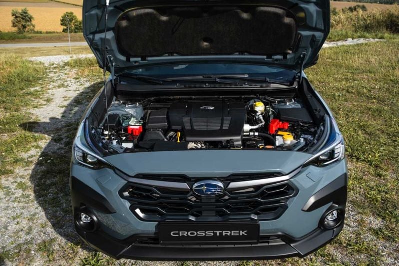 Voor de aandrijving zorgt, net als voorheen, de e-Boxer. Tussen de in lengterichting geplaatste motor en de automatische transmissie (cvt) zit een kleine elektromotor die wordt gevoed vanuit een 0,6 kWh -accu. Die geeft de turboloze viercilinder in het onderste toerengebied een beetje meer koppel en hij draagt bij aan een lagere CO2-uitstoot. Die is met 174 g/km nog steeds hoog. Althans, voor Nederlandse begrippen en de daaruit voortvloeiende bpm-calculatie. Plankgas betekent een motor die direct hoog in toeren klimt en daar ook blijft. Zou er een iets zwaardere elektromotor achter hangen, dan kon je wat meer op koppel rijden en dus lager in toeren kunnen blijven. Dat lukt in de Crosstrek niet tijdens snel accelereren. Ben je wat beschaafder met je rechtervoet, dan houdt de vernuftige cvt het toerental aangenaam laag, zeker op constante snelheid.