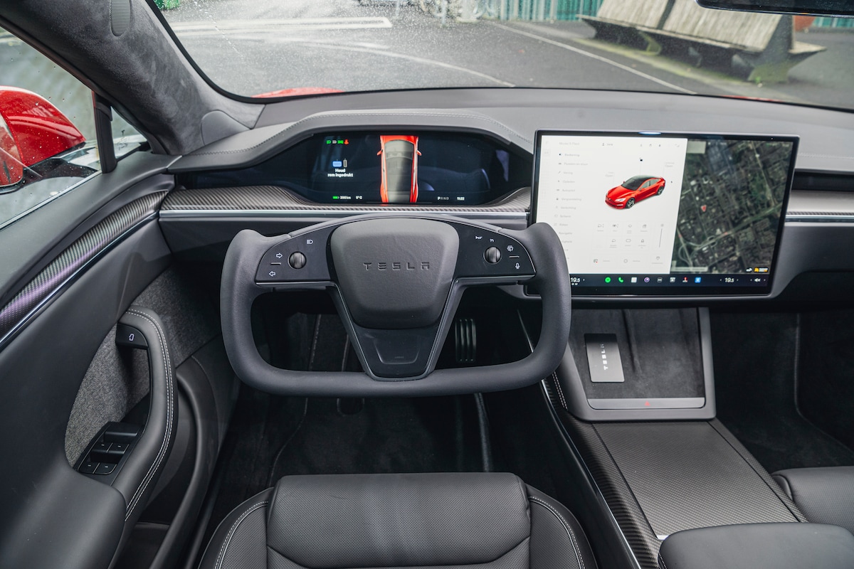 Dat kan, die is fors vernieuwd. Niet alleen bij de Plaid, maar ook bij de Long Range. Het verticale scherm maakte plaats voor een horizontale variant en de materialen gingen er fors op vooruit. Dat mocht ook wel natuurlijk. In tegenstelling tot in de Model 3 is hier ook een scherm met info recht voor je neus. Het blijft een Amerikaanse auto, dus we hebben wel bekerhouders, maar verder een beetje weinig aflekplek. De achterpassagiers hebben nu hun eigen multimediascherm gekregen, waarop je bijvoorbeeld Netflix of Disney+ kunt kijken. Handig voor kinderen. Volwassenen zijn wellicht minder te spreken over de zithoek, want die is door de hoge bodem helaas erg onprettig. Een EV-euvel, maar hier nog meer dan gemiddeld. De kofferbak is zeer groot met 792 liter en bovendien erg toegankelijk door de vijfde deur. De bediening van het multimediasysteem lijkt op dat van bestaande Tesla’s die hetzelfde operating system hebben, dankzij hun over-the-air-updates. Wel is de hardware sneller, want nieuwer. Het werkt prettig, logisch en feilloos. Wel apart, schakelen (en de P-stand) gaat nu ook via het touchscreen, er is geen pookje meer. Mocht het scherm uitvallen, zitten er ook knoppen bovenaan de middentunnel. De rest van de bediening zit op het yoke-stuur.