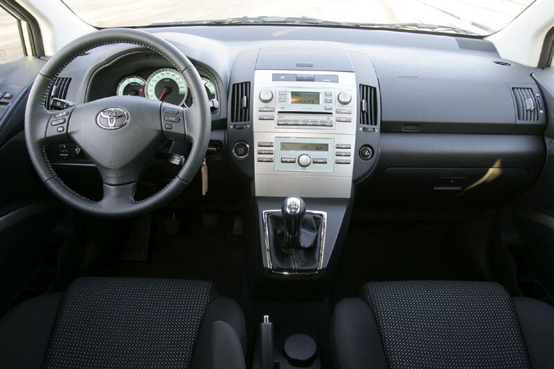 Het interieur van de standaard Corolla Verso heeft ruim voldoende te bieden. De zitpositie is perfect in te stellen, met een in hoogte plus lengte verstelbaar stuur en dito voorstoelen. Je kunt de stoel lekker diep zetten, zodat je niet dat 'op de bok'-gevoel krijgt, maar de auto als het ware om je heen voelt. Jammer alleen dat de zittingen van de verder prima voorstoelen wat aan de korte kant zijn. Voor onze neus zit een zeer strak vormgegeven dashboard, met mooie materialen en een als vanouds oerdegelijke afwerking. Het geheel ziet er harmonieus uit.