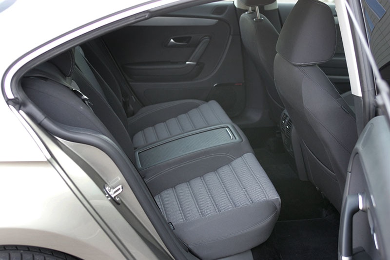 De gimmick van de Passat CC zit hem natuurlijk na de B-stijl, waar de aflopende daklijn ervoor zorgt dat hij de titel 'coupé' mag dragen. Het mag er dan wel fraai uitzien, het instappen wordt er niet eenvoudiger op. Heb je je eenmaal naar binnen gevouwen, dan heb je weinig meer te klagen. Twee riante stoelen worden van elkaar gescheiden door een afsluitbaar opbergvak. De beenruimte is riant, de hoofdruimte beperkt. Maar als je als lang persoon wat onderuit zakt, valt er best mee te leven. Het paradoxale is dat je achterin eigenlijk het beste zit; wie in de luxe positie verkeert om zich te láten rijden, zal kiezen voor een auto met meer hoofdruimte achterin. Het gebrek aan hoofdruimte is bij de Passat CC gewoon de cool tax die je betaalt.