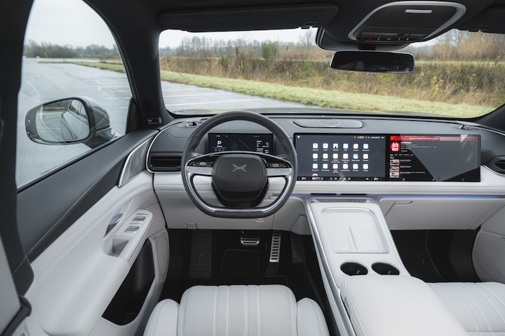 Voor Xpeng is de G9, die verscheen in 2021, het meest verkochte model in Nederland, met 1.302 registraties in 2024. Het merk bestaat sinds 2014, de eerste auto stamt uit 2018. Het is bijna beangstigend in welk tempo de ontwikkelingen gaan en we kunnen ons voorstellen dat er flink gezweet wordt op de kantoren van de Duitse premiummerken. Op dit moment vermeldt de prijslijst drie modellen van Xpeng: de P7 (een sedan), de G6 (concurrent van de Model Y) en de G9. Die is er als achterwielaandijver met een kleine of grote accu en er is de Performance met vierwielaandrijving. Qua vormgeving vaart het merk een veilige koers met de G9 en daarmee valt deze SUV waarschijnlijk bij een breed publiek in de smaak. Hooguit kunnen we de naafkapjes op de wielen als kitsch betitelen, de rest oogt en voelt hoogwaardig. Stap in en je wordt bijna overweldigd door de overdaad aan luxe of op zijn minst geïmponeerd door de afwerking en de materialen. Bedenk het en deze auto heeft het. Het bedieningsconcept is deels van Tesla gepikt, maar daarin staat Xpeng niet alleen. We moesten wel even zoeken naar het menu om de spiegels te verstellen, dat zit verstopt onder de knop ‘rijmodus’. De hendels aan het stuur lijken uit de magazijnen van Mercedes-Benz te komen. De software-update heeft veel irritante piepjes weggenomen en Apple CarPlay/Android Auto toegevoegd.