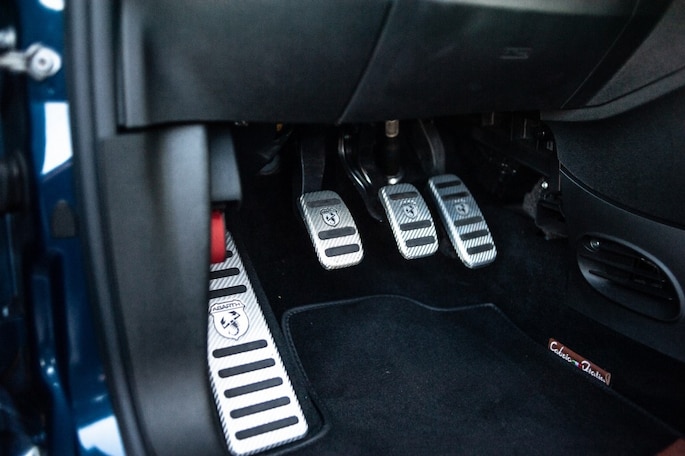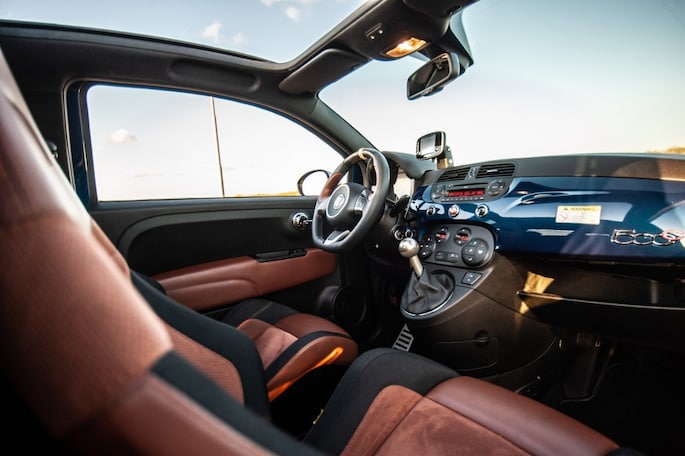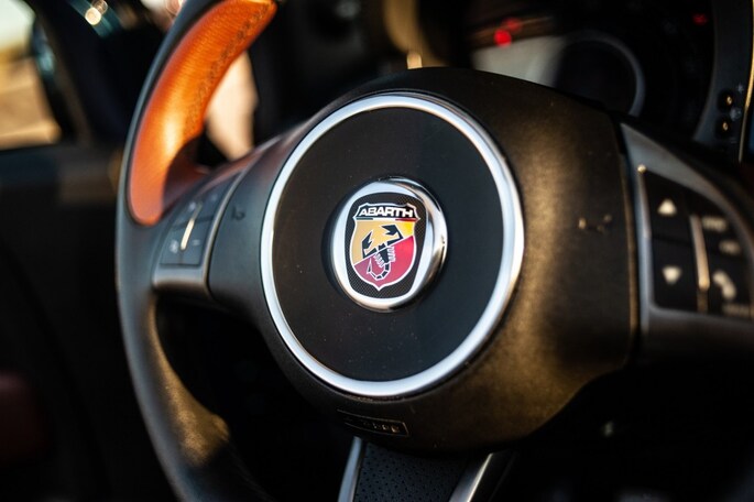 Abarth staat erom bekend om van de meest aaibare autos heuse racemonsters te maken. Dankzij vuistdikke uitlaten, stoere velgen, aangedikte bumpers en spoilers heeft de 500 Cabrio Italia ook de uiterlijke kenmerken van een hothatch. Voor extra vuurwerk zorgt deze Cabrio Italia, uitgerust met het blauwe lakwerk, velgen in maatje 17 inch ( 205-40R17) en daarachter gele remklauwen. Een must-have combi voor een Abarth, mij hoort u niet klagen! En dan kan het dak ook nog eens volledig open: feest gegarandeerd! En het blijft allerminst bij looks alleen. Een fraai volledig bruin lederen Abarth interieur incl. carbon bucket seats zorgt voor een aangenaam binnen klimaat. Een Climate Control moet voorkomen dat het al te heet wordt aan boord van de Italiaanse bom.