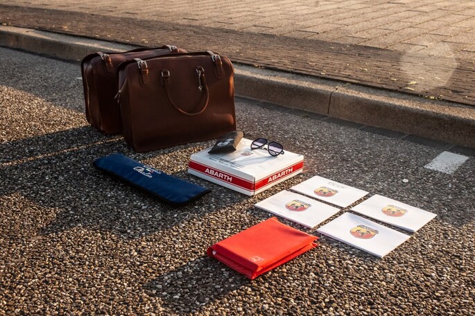 Incl. alle originele accessoires, te weten: lederen tassenset van Tramontano en een modieuze zonnebril, type Azzurro 150, van Independent Italia, originele autohoes, alumiumium tankdophouder en Abarth navigatiesysteem + modern TomTom navigatiesysteem.