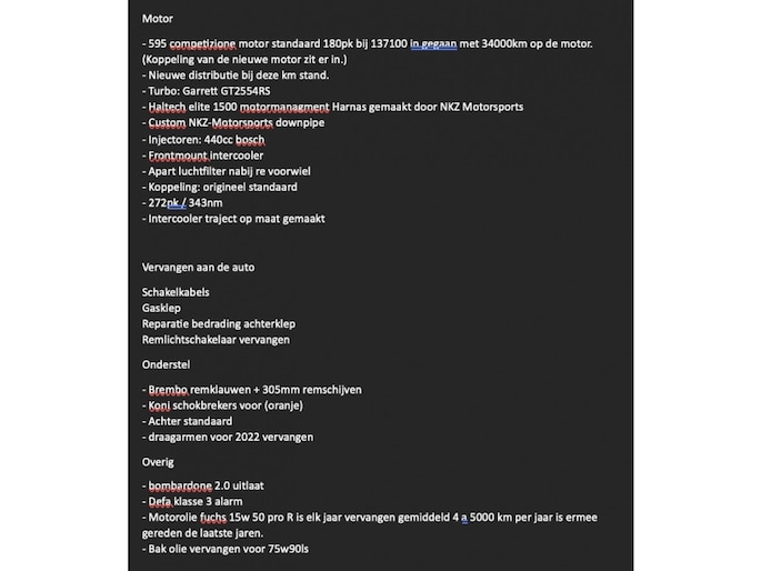 - 595 competizione motor standaard 180pk bij 137100 in gegaan met 34000km op de motor. (Koppeling van de nieuwe motor zit er in.)