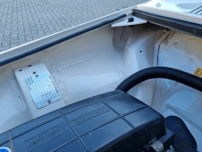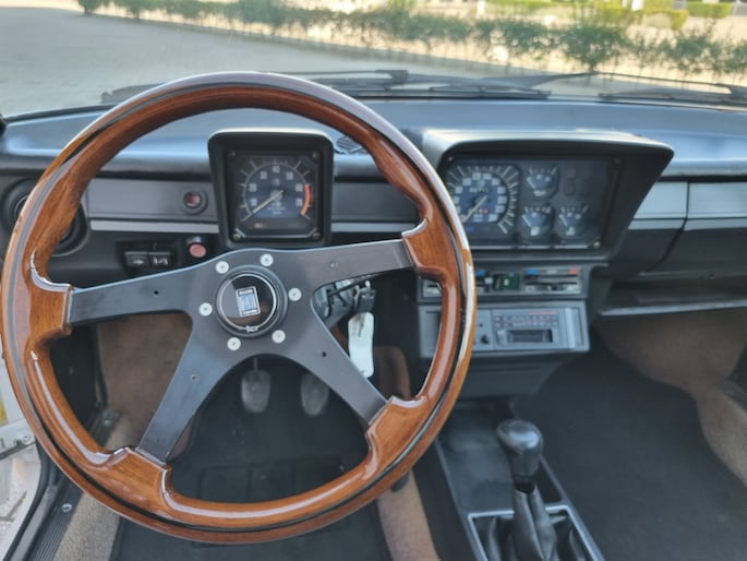 Keiharde BiancoSpino carrosserie met zichtbare puntlasjes en perfecte naden. En kijk eens naar het interieur... lichtblauw velours, dat is toch echt veel mooier dan skai. En dat dasboard met de centrale toerenteller, prachtig. En met een mooi Nardi stuur.