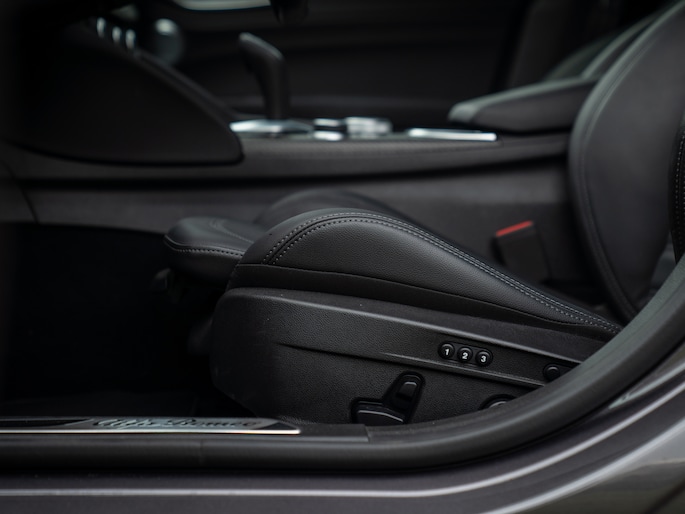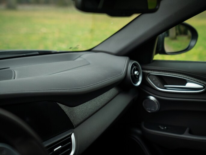 De echte kenner zal het laatste modeljaar van de Giulia Q met zijn of haar ogen dicht herkennen. Toch kunnen we het niet laten om kort de highlights te doorlopen. Met de nadruk op ‘lights’, want de herziende indeling van de koplampunits behoren toch wel tot de meest karakteristieke veranderingen. De 3 afzonderlijke LED-elementen per unit doen oude Alfa-tijden herleven, met de iconische 159 nog vers in ons geheugen. De donkere achtergrond van diezelfde koplampen zijn op hun beurt helemaal in lijn met de “smoked” achterlichten vanachter helder glas, alsmede de antracietkleurige Leggera-velgen, donkere Scudetto grille, dito spiegelkappen en vele carbon exterieurdetails. Onder andere de frontlip, side skirts en kofferklepspoiler zijn carbon-made. Het contrast met de geweldige Grigio Vesuvio lak is beeldschoon en weet iedereen te boeien. Wel óf geen autofanaat. Al denken we zeker te weten tot welke categorie de lezer behoort…