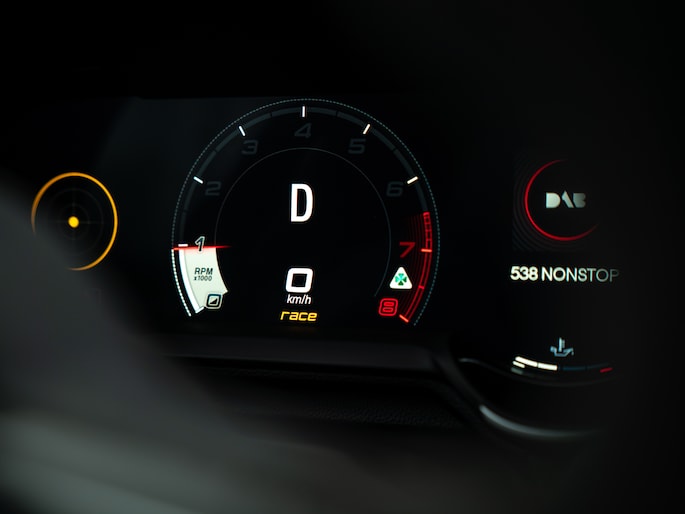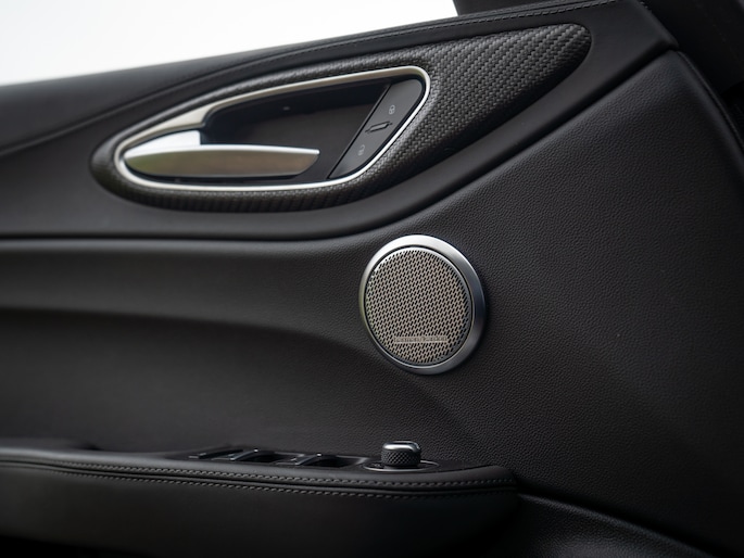 Binnen volgt het ene na het andere carbon hoogtepunt zich in een recordtempo op: midden-/tunnelconsole + dashboard finish laten zien uit welk racehout de in basis ‘keurige’ 4-deurs Berlina is gesneden. Alfa koos er bij deze generatie Giulia Q voor om ook de ultieme Veloce zetels te leveren, elektrisch verstelbaar, verwarmbaar en met memory! De Nero bekleding treft u tevens op het dashboard + het afgevlakte sportstuur – inclusief carbon insert. Klassieke cijfers in digitale vorm nemen u mee terug naar vervlogen tijden. Tijden waarin digibeten nog niet bestonden en instrumentenpanelen analoog waren. Zó’n gevoel hoort de échte sportauto een liefhebber te geven!