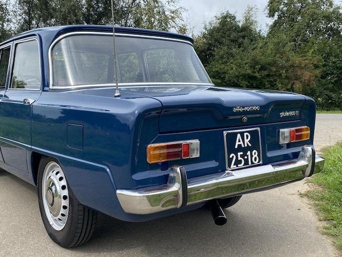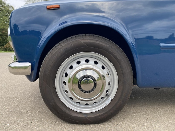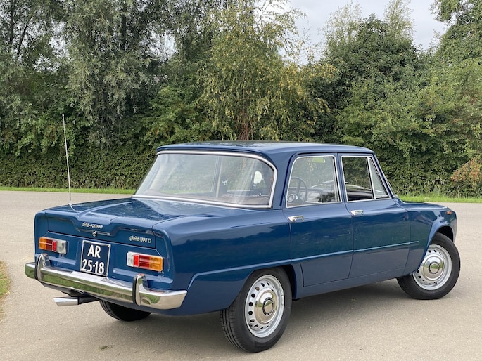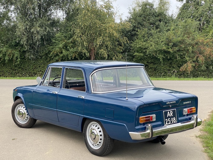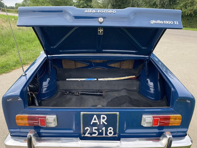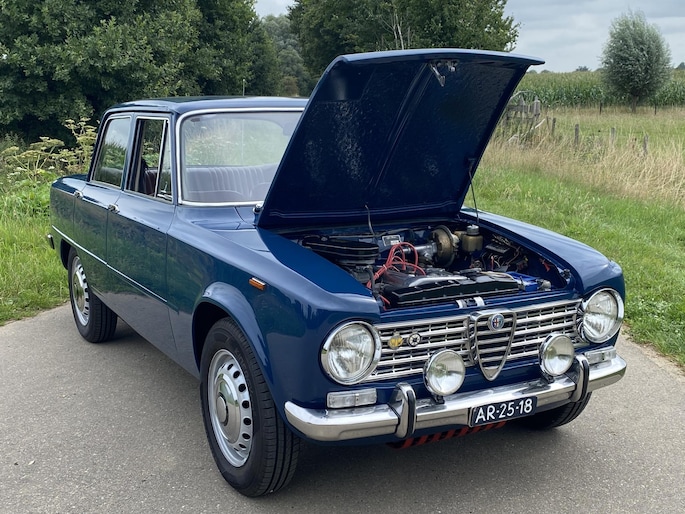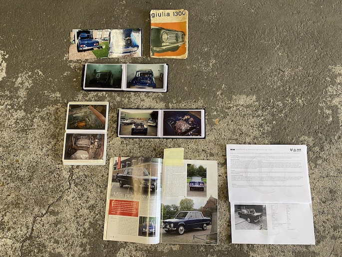 In 1966 is deze Alfa Romeo Giulia afgeleverd aan zijn eerste Italiaanse eigenaar in Farnese (Italie). Begin jaren 90 is de auto door een Nederlandse Alfa Romeo liefhebber naar Nederland gehaald met kapot motorblok maar een harde carrosserie. In 1994 stond de Giulia te koop in het clubblad van de Alfa Romeo club en kocht de laatste eigenaar de auto als hobbyproject. In 1995 starte de volledige demontage van de auto. Stapje voor stapje is er een plan gemaakt en is de auto in 1999 opnieuw gespoten in zijn prachtige blauwe kleur. De koets was dusdanig hard dat er niet aan gelast hoefde te worden. Het hele proces is vastgelegd in fotoboekjes.