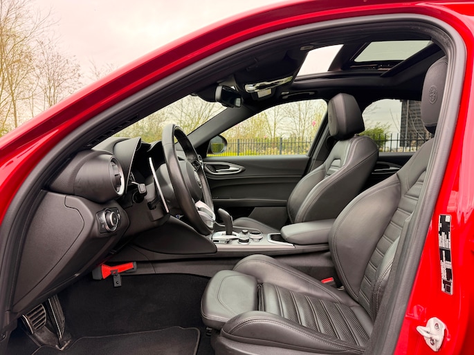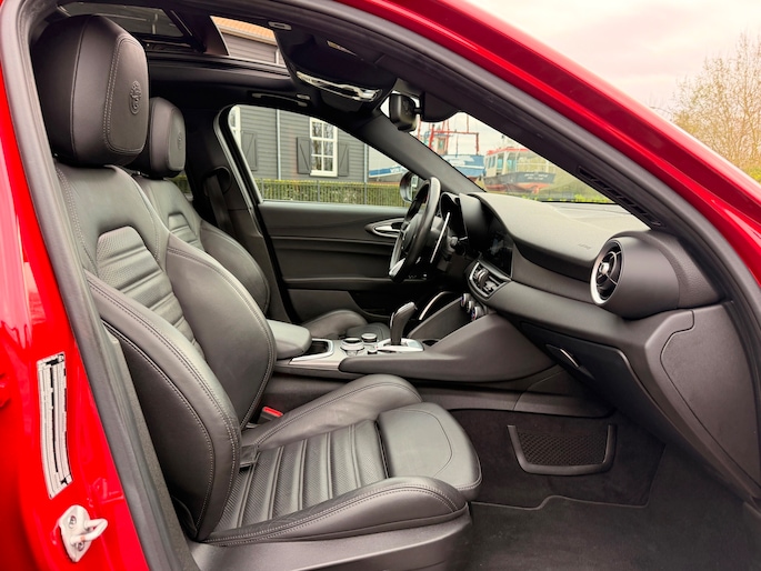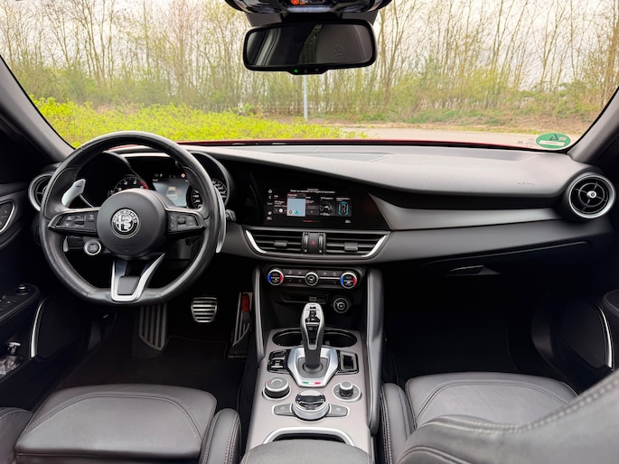 De luxe en comfort komen volop tot hun recht in deze Giulia, dankzij elektrische en verwarmbare sportstoelen met lederen bekleding, een verwarmd lederen sportstuur, adaptieve cruise control, full-map navigatie en een geavanceerd multimedia-systeem inclusief Apple CarPlay/Android Auto en DAB-radio. Regensensoren, een achteruitrijcamera en parkeersensoren voor en achter zorgen voor ultiem gemak tijdens het rijden en parkeren.