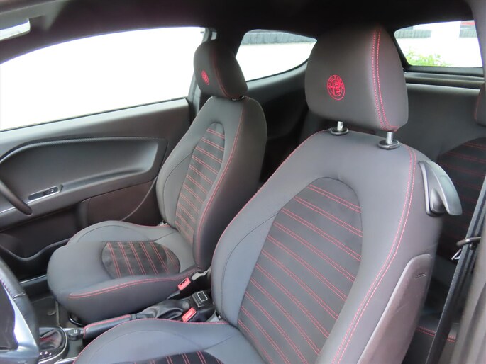 - Sportstoelen bekleed met stof en alcantara afgewerkt met rode stiksels