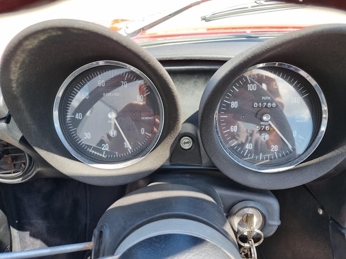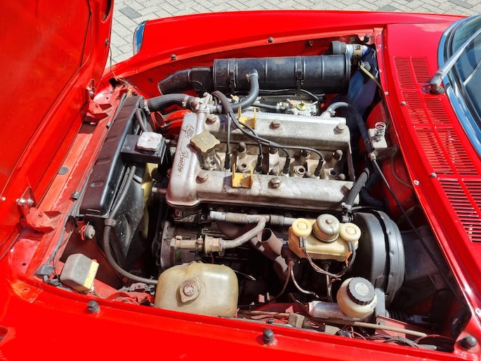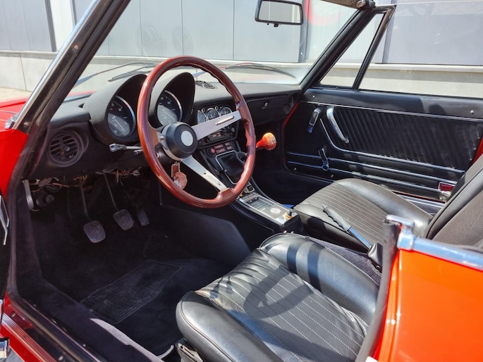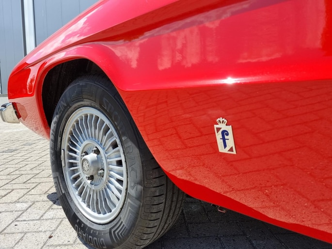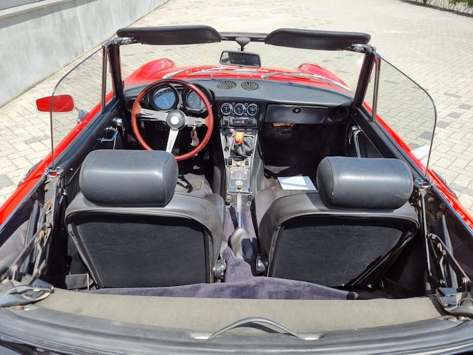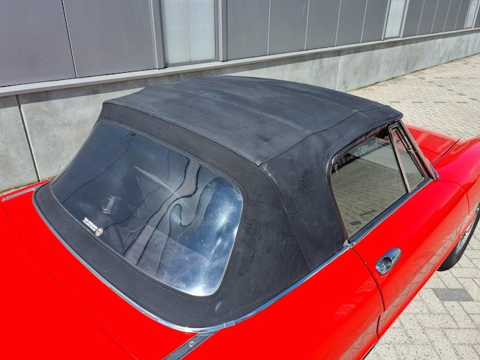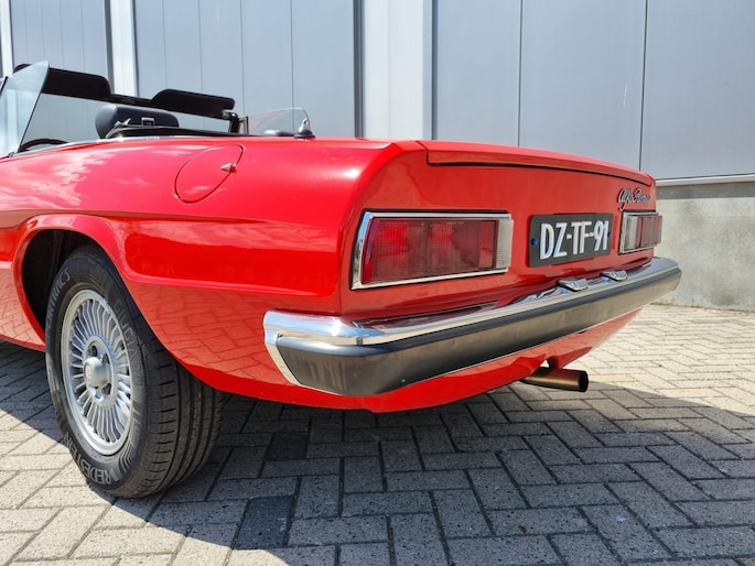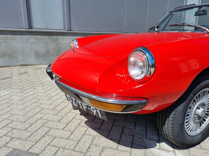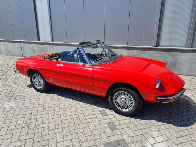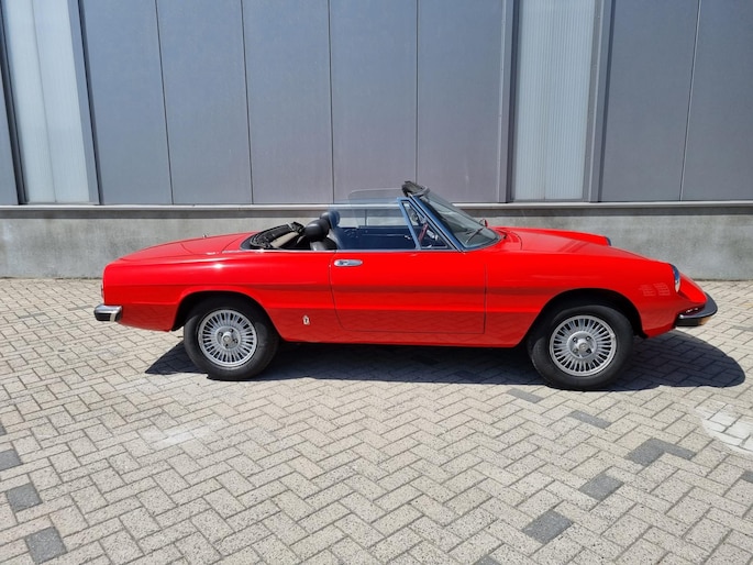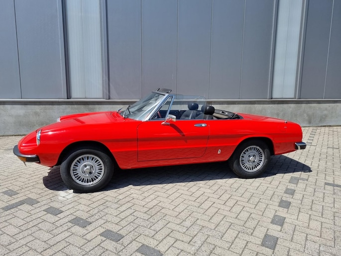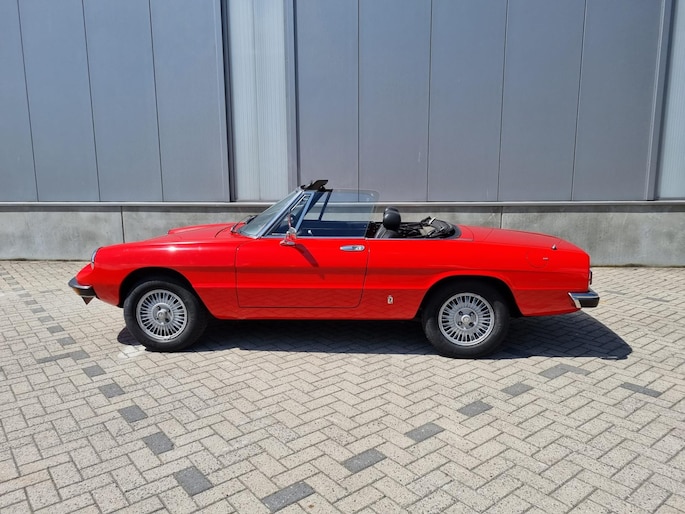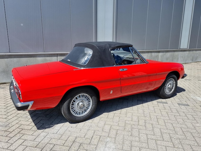 Alfa Romeo Spider 2.0 Coda Tronca uit 1978. Alfarood met zwarte kap, chrome bumpers en 14 inch lichtmetalen velgen.