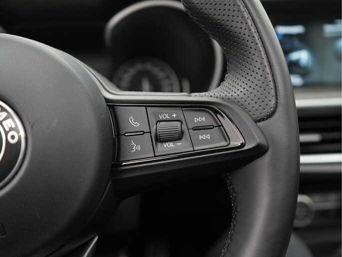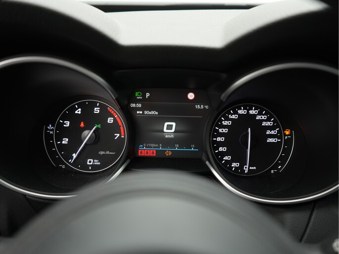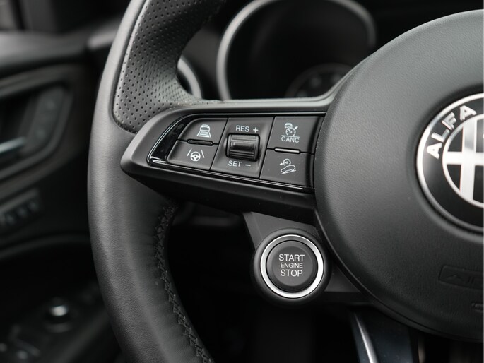 In één oogopslag heb je alle benodigde functies onderweg in beeld, dankzij het slim ingedeelde digitale dashboard. Altijd achter zicht, nooit meer nekkramp! De achteruitrijcamera maakt het supermakkelijk. Adaptive cruise control is veilig en comfortabel. De snelheidsregelaar houdt automatisch afstand tot het voertuig dat voor je rijdt. Filerijden zal nooit een pretje worden. Maar met de file assistent wordt het wél relaxter. Deze geavanceerde optie zorgt dat je automatisch de juiste afstand tot de voorligger houdt en remt bovendien als de rij tot stilstand komt. Dankzij Connected Services weet je precies waar je auto geparkeerd staat. Ook andere functies, zoals bandenspanning en brandstofniveau, zijn via de app altijd onder handbereik. Deze Alfa Romeo is voorzien van full map navigatiesysteem, automatische airconditioning, schakel flippers aan het stuur, draadloos opladen, DAB ontvangst en regensensor.