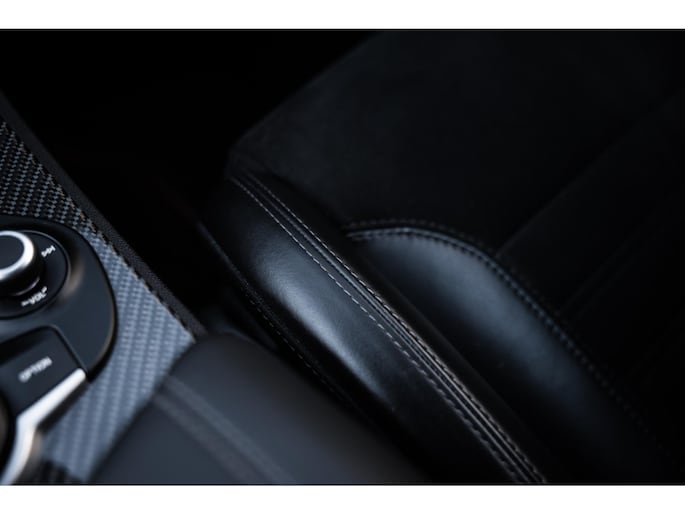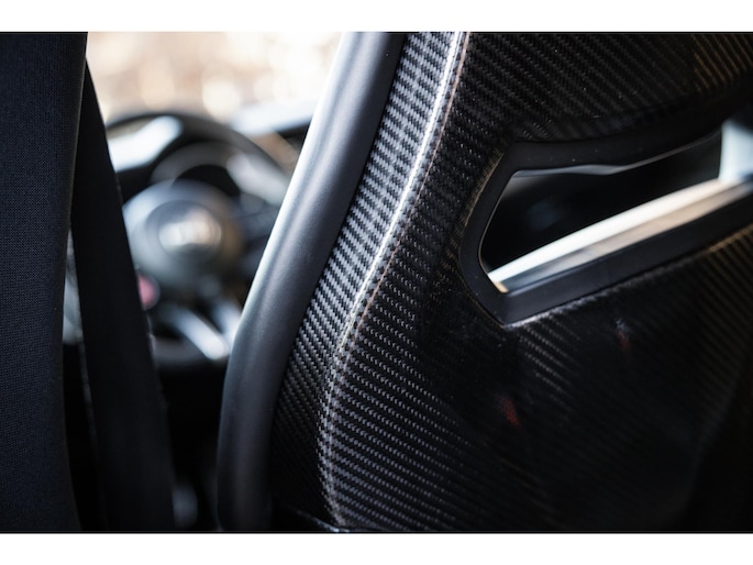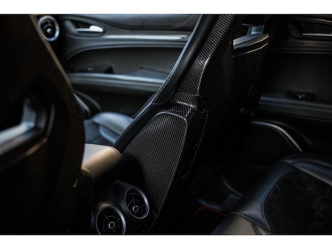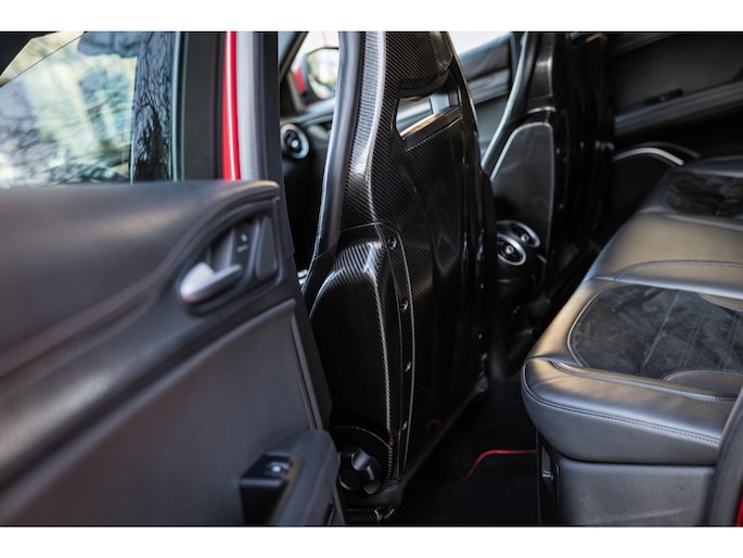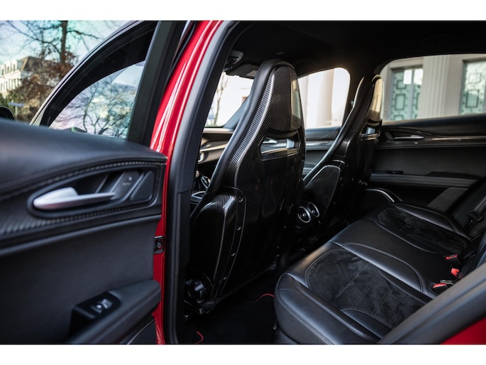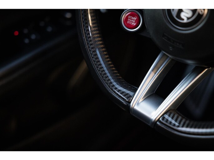 En dan het interieur. Deze Stelvio is voorzien van de zeldzame af fabriek geleverde Sparco carbon kuipstoelen. Bekleed met een dun laagje zwart leder en alcantara. Een perfecte zit met veel zijdelingse steun, maar tevens een lust voor het oog. Het is prachtig. De carbonelementen geven hem de racy uitstraling. Kijk eens naar het stuurwiel, de startknop, de uitstraling gaat perfect samen met de potentie.