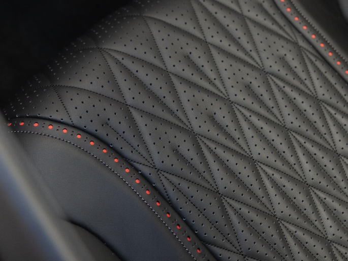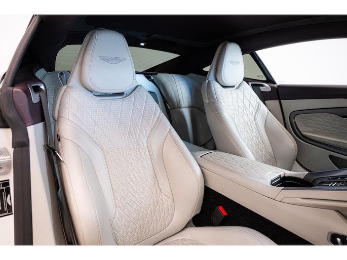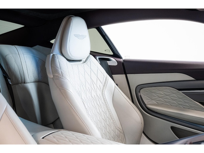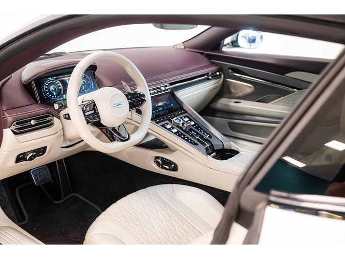 Het interieur ademt vakmanschap en comfort. Het beschikt over Zilverkleurige stiksels met brogue detailing, Lux Quilting + Lux Perforation, en Comfort Seats in 2+2-configuratie die zowel verwarmd als geventileerd zijn. De gele headrest-embroidery met Aston Martin Wings, de Alcantara vloerbedekking en de leren hemelbekleding zorgen voor een exclusieve ambiance. De Dark Brushed Aluminium sierlijsten met Satin Silver accenten en het verwarmbare stuurwiel in Light Argento Metallic leder completeren het interieur.
