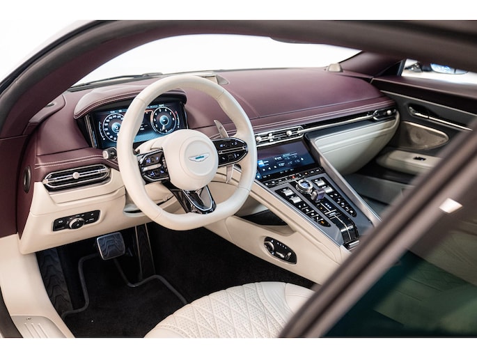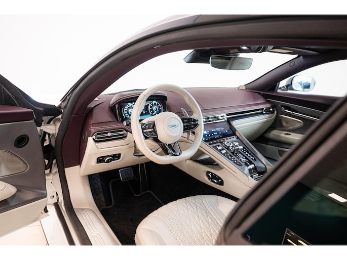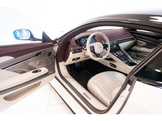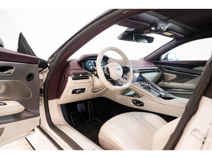 De DB12 is uitgevoerd in de exclusieve kleur Neutron White Special Paint (Q Special), gecombineerd met een luxueus ‘Inspire – Light Duotone’ interieur in Deep Purple en Light Argento Metallic semi-aniline leder. Deze harmonieuze samenstelling onderstreept perfect het sportieve en elegante karakter van de DB12.
