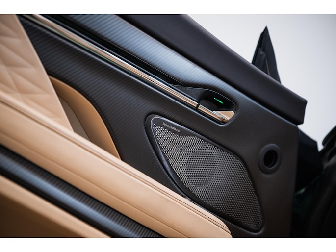The interior of this Aston Martin DB12 Volante is luxuriously appointed in a beautiful combination of Ivory Gold Pearlised leather, with Obsidian Black Alcantara headlining, Comfort Seats, Mirrored Stitching and Satin Silver accents. The finishing touch is provided by bespoke brake calipers painted in Iridescent Emerald.