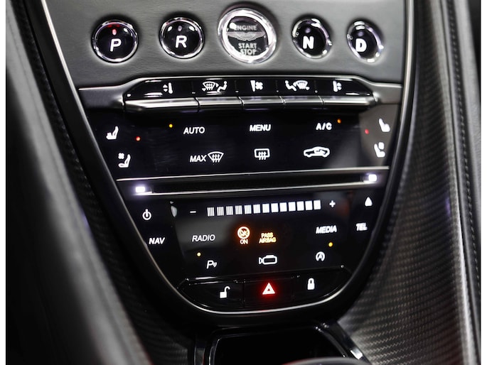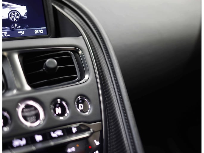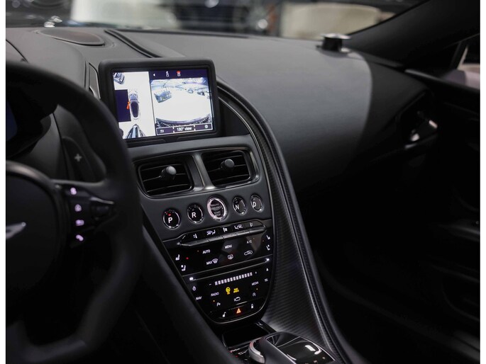 Wanneer het portier open gaat vallen wij even stil… De details, wat een ambacht! Het handgemaakte interieur is bekleed met Obsidian Black volleder en volledig handgestikt met Obsidian Black stiksels, inclusief geborduurd Aston Martin logo in de hoofdsteunen. Ook hier is het carbon wat de toon zet. En natuurlijk zijn ook de Bang & Olufsen tweaters op het dashboard een must have bij een DBS Superleggera.