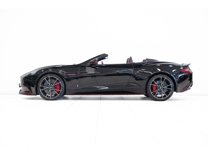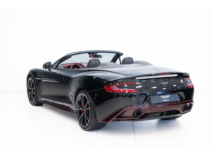 Deze unieke Aston Martin Vanquish Volante 8-Speed uit modeljaar 2015 is gespecificeerd in Storm Black – een diepe zwarttint met subtiele rode metallic deeltjes – en bekleed met Chancellor Red & Obsidian Black leder.