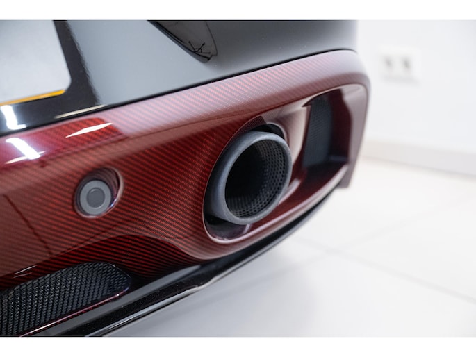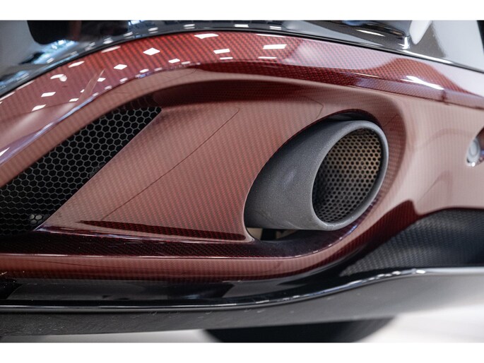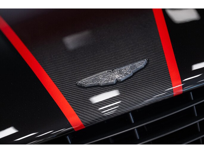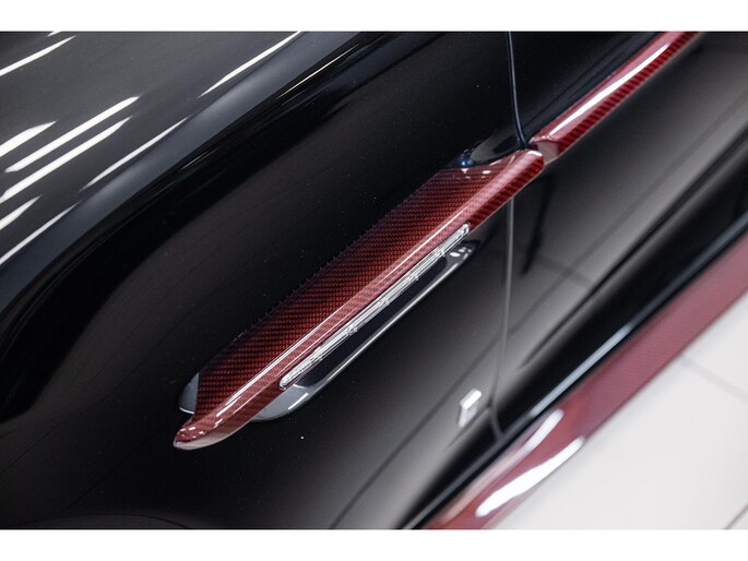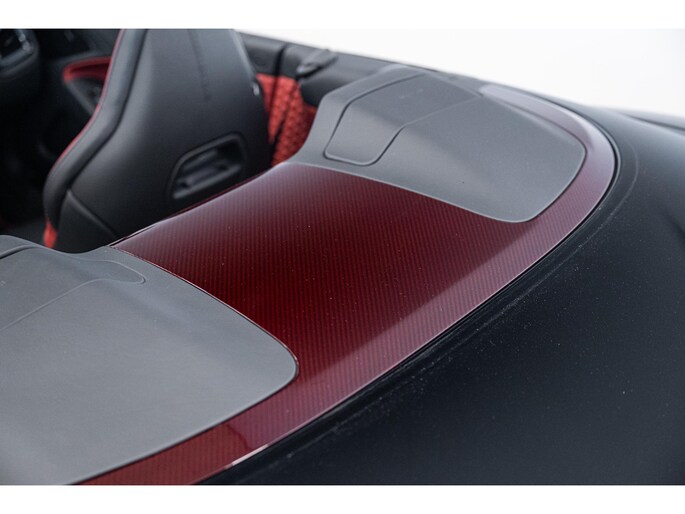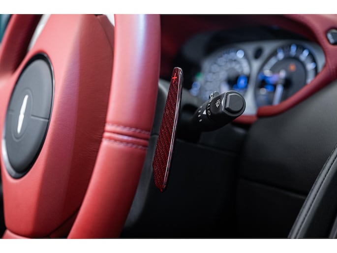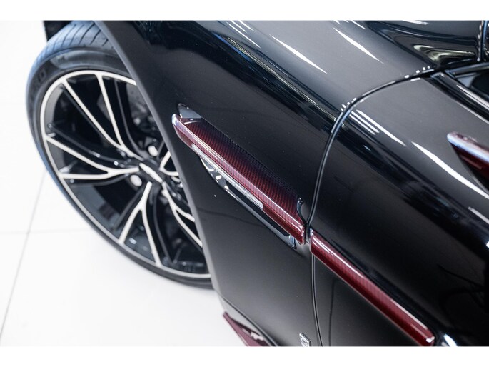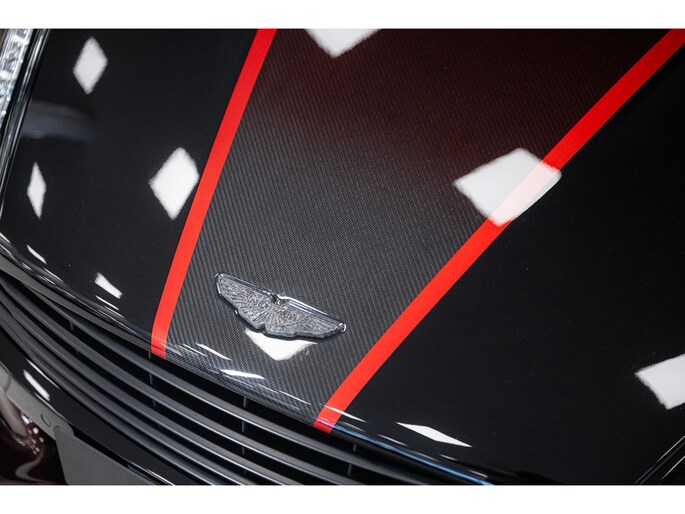 The Q by Aston Martin content takes this Vanquish Volante to a higher level, with numerous red-tinted exposed carbon fibre elements such as the bonnet, front splitter, side strakes, mirror caps, and rear diffuser. Even the tonneau cover and paddle shifters are finished in this exclusive carbon treatment. Machined carbon fibre sill plaques and AM wings badges complete the highly customised package.