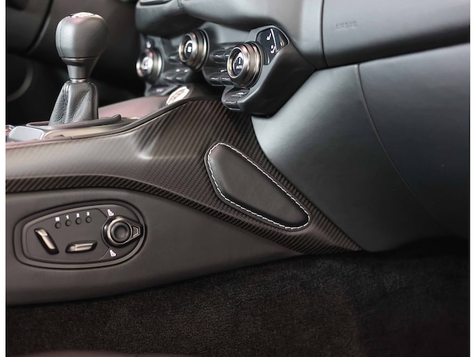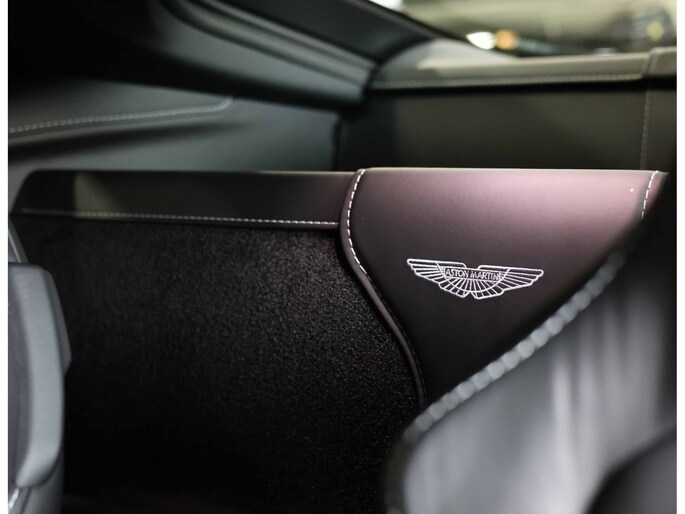 Het interieur is zoals we van Aston Martin gewend zijn. Een geweldig design dat met de hand is vervaardigd. Het gehele interieur is bekleed met Obsidian Black leder en voorzien van zilver contrasterende stiksels. Zelfs de binnenhemel is bekleed met leder en versierd met perforatie en zilveren stiksels. Om te matchen met het exterieur vinden we ook hier carbon afwerking op de middentunnel en het dashboard.