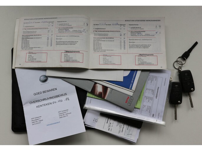 Beide originele sleutels en de originele opbergmap met alle boekjes zijn aanwezig, inclusief een volledig afgestempeld onderhoudsboekje, tot 160dkm bij de Audi dealer.