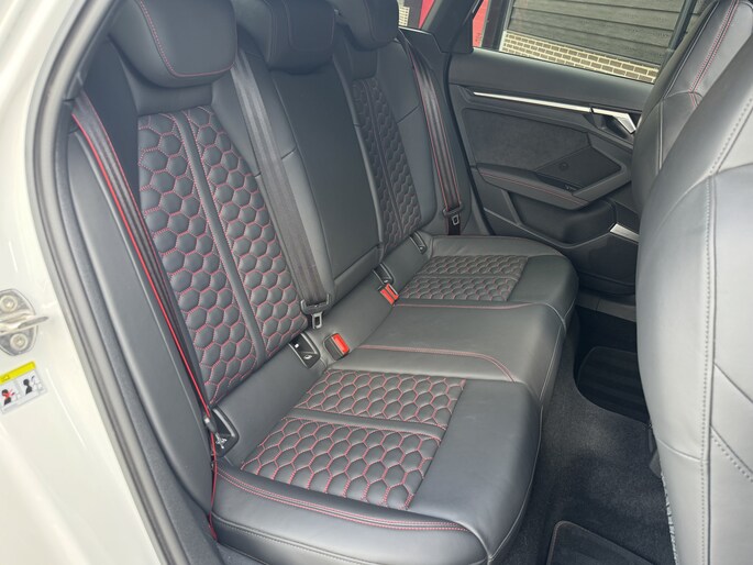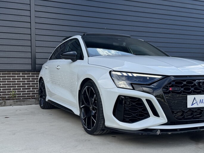 Mega volle Audi RS3 in de unieke kleur ''Glacier White'' met rode RS remklauwen, panoramadak en hoogglans zwarte details.