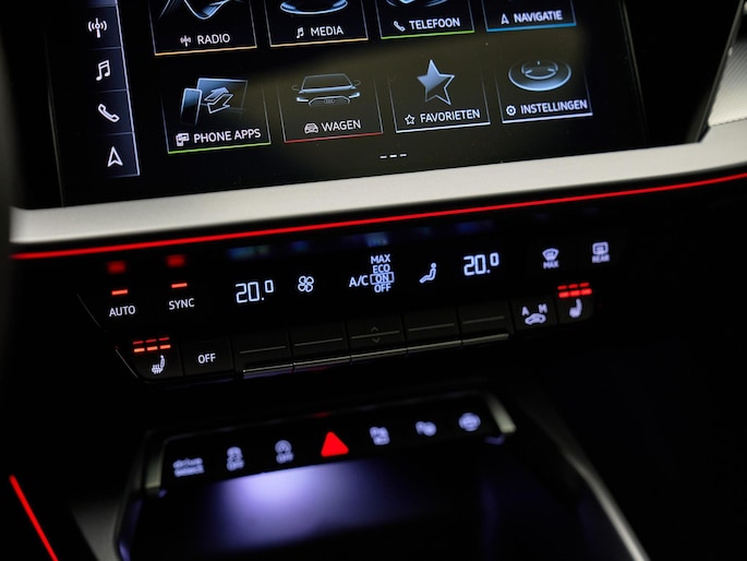 Deze Audi A3 biedt ongekend comfort en gemak. Het Panoramisch glazen dak (3FB) laat extra licht binnen en versterkt het ruimtelijke gevoel in de auto. Het Ambiente-lichtpakket Plus (QQ2) zorgt voor sfeervolle verlichting in het interieur en biedt de mogelijkheid om kleuren naar wens aan te passen. De Comfortsleutel (4K5) maakt instappen en starten gemakkelijk zonder de sleutel actief te gebruiken, terwijl de Automatisch dimmende binnenspiegel, frameloos (4L2) verblinding voorkomt. Dankzij de Klimaatregeling Plus (PYC) is het interieur altijd aangenaam, ongeacht het weer buiten.