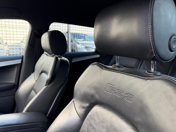 Deze RS3 is niet alleen snel, maar ook rijk uitgerust. De auto beschikt over lederen RS-sportstoelen die zowel comfort als zijdelingse steun bieden, xenon- of LED-verlichting, parkeersensoren, climate control en cruise control. Daarnaast is hij voorzien van 19 inch lichtmetalen velgen.