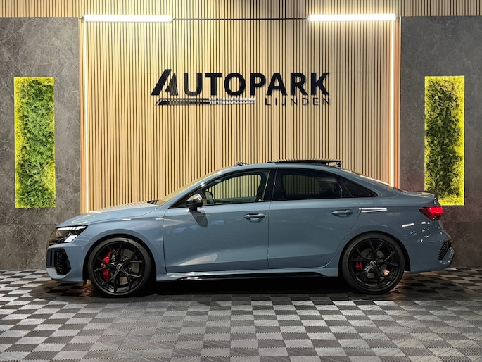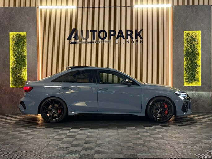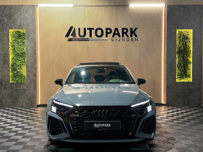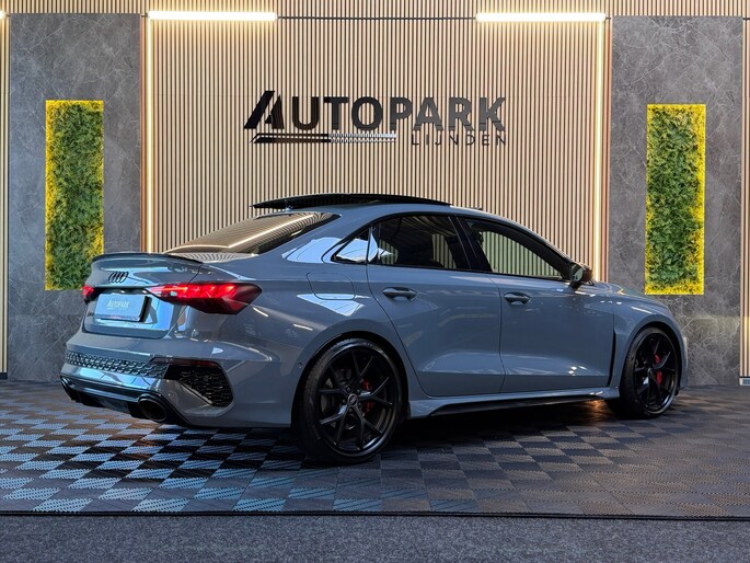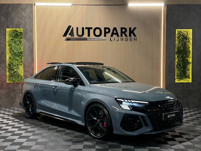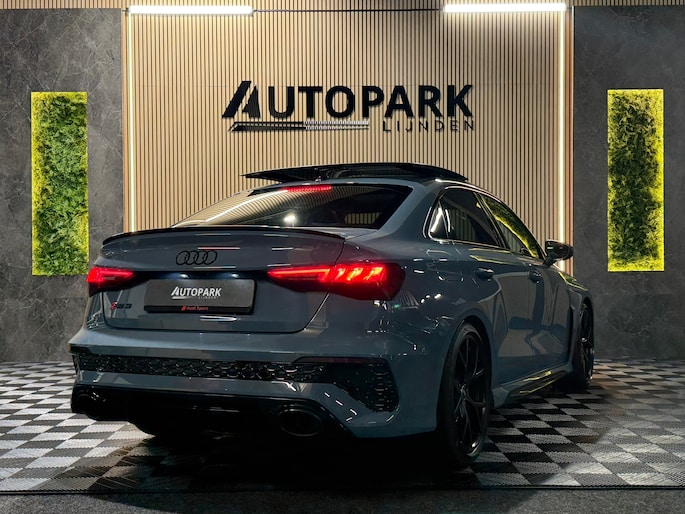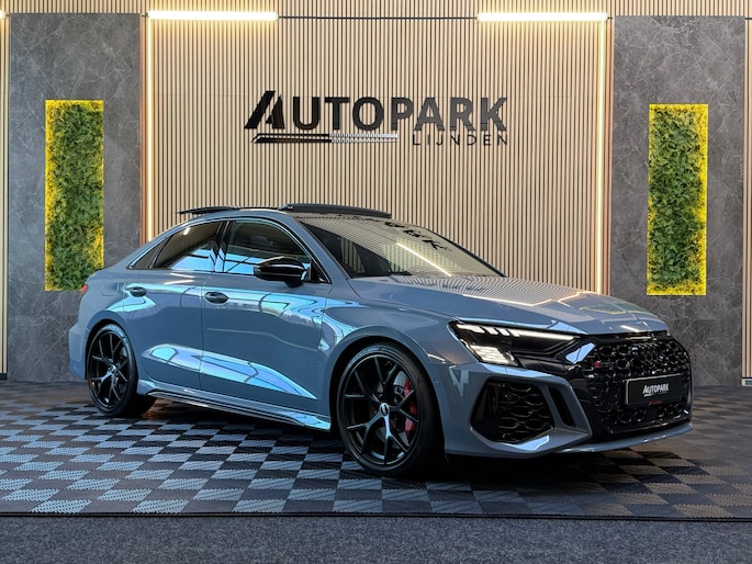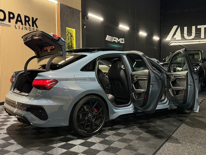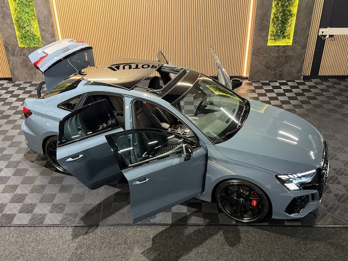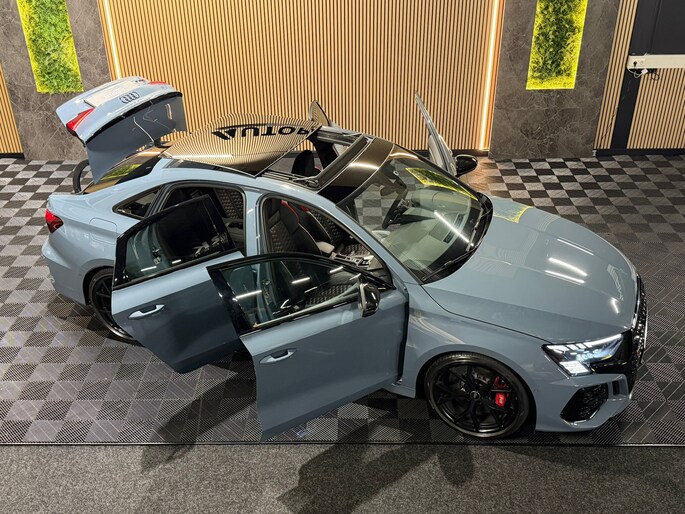 Deze Audi RS3 Limousine in Kemora Grey is geen doorsnee sport sedan, maar een statement op wielen. Onder de motorkap ligt de legendarische 2.5 TFSI vijfcilinder met 400 PK. In combinatie met de razendsnelle S tronic en het quattro vierwielaandrijvingssysteem sprint deze RS3 in 3,8 seconden naar de 100 km/u. Het karakteristieke vijfcilinder geluid maakt elke rit verslavend.