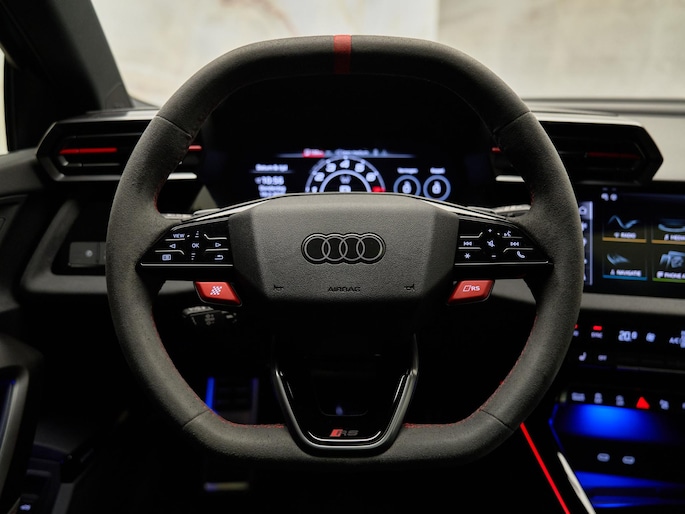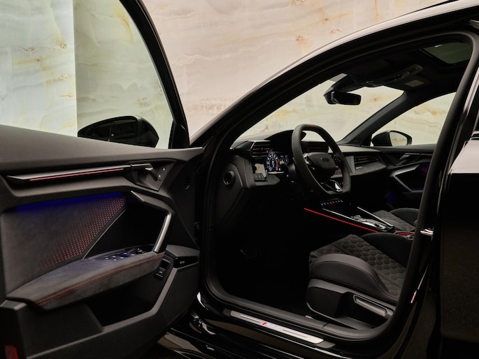 Deze Audi RS3 combineert sportiviteit met hoogwaardig comfort. De Comfortsleutel zonder safelock (4K5) maakt instappen en starten eenvoudig zonder de sleutel actief te gebruiken, terwijl de Achterklep met comfortopening (4E6) extra gebruiksgemak biedt bij het in- en uitladen. Binnenin zorgt de Climatronic met bediening achterin (KH5), aangevuld met het Climate control package plus (PYC), voor een aangenaam interieurklimaat onder alle omstandigheden. Het Lichtpakket pro met ambient lighting (QQ3) creëert een exclusieve sfeer in het interieur, volledig in lijn met het premium karakter van de RS3.