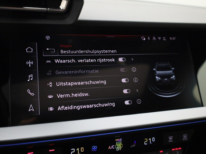 Met de nieuwste technologieën aan boord is deze Audi in staat om zelf te reageren op potentieel gevaarlijke situaties op de weg. Onderweg fungeert de verkeersbord-detectie als het ware als uw bijrijder en attendeert u op de verkeersborden langs de weg. Voorzien van het Lane-keeping systeem. Ofwel: blijf automatisch in je baan. Bij een noodstop gebeurt er heel veel tegelijk: gas los, rempedaal in, kijken, sturen. Dan is het een veilig gevoel dat de Brake Assist uw remactie tot het maximum oppept. De veiligheid van deze auto wordt verder verhoogd door hill hold functie en bandenspanningcontrolesysteem.