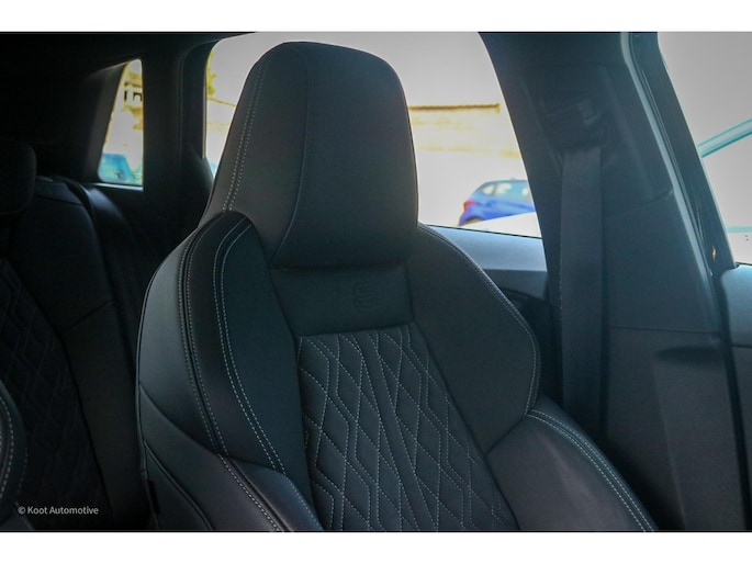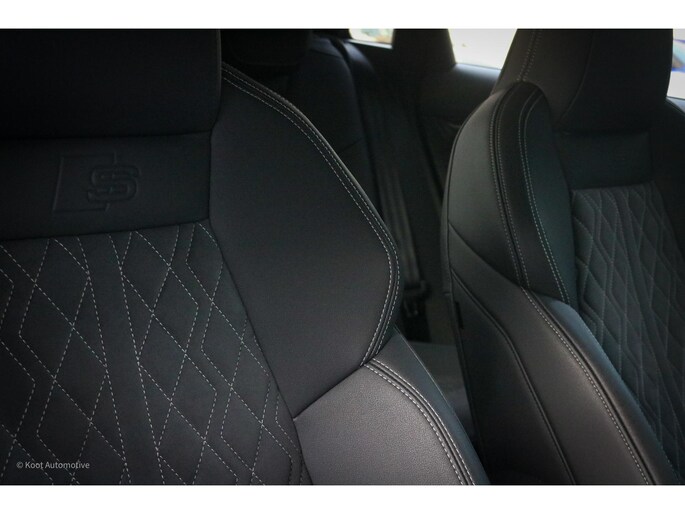 Het interieur is uitgevoerd met S line sportstoelen in stof en Dinamica microvezel, afgewerkt met karakteristiek ruitstiksel en contrasterende naden. De stoelen bieden goede zijdelingse steun en dragen bij aan het sportieve karakter van de auto. Aluminium interieuraccenten, een afgevlakt S line sportstuur en een strak vormgegeven dashboard geven het interieur een moderne en hoogwaardige uitstraling. De materialen en afwerking zorgen voor een rustige en kwalitatieve ambiance die kenmerkend is voor de nieuwste generatie Audi.