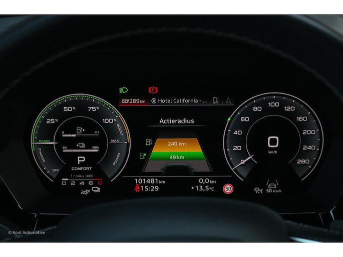 De aandrijflijn bestaat uit een efficiënte 45 TFSI benzinemotor gecombineerd met een elektromotor, goed voor een gecombineerd systeemvermogen van 245 pk en 400 Nm koppel. In de praktijk resulteert dit in een bijzonder soepele en krachtige rijervaring. De auto accelereert moeiteloos en voelt dankzij het directe elektrische koppel levendig en responsief aan. Tegelijkertijd biedt het plug-in hybride systeem de mogelijkheid om korte ritten volledig elektrisch af te leggen, wat zorgt voor stille en efficiënte mobiliteit in dagelijks gebruik.