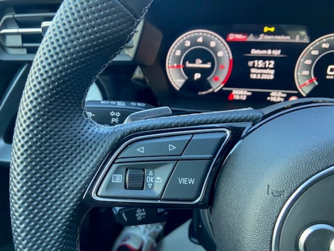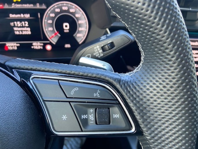 - Driespaaks lederen sportcontourstuur, afgevlakt aan de onderzijde, multifunctioneel plus, met stuurpaddels (2PK)